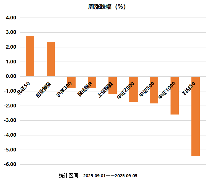 9月首周沪指止步周线四连阳,市场走的惊心动魄,各大宽基指数上蹿下跳波动异常的剧烈,截至周五收盘,全周仅北证50、创业板收红,其余宽基全线下跌。其中科创50指数本周深蹲5.42%,详细数据大伙看下图:
