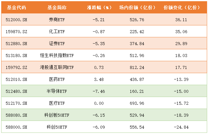 其二,11只ETF本周份额增长超过了10亿份,其中,两只券商类主题ETF份额合计增长超过65亿份,此外,化工ETF、两只港股互联网ETF份额增长均超过35亿份。份额流出方面,主要是科创50ETF以及医药类几只ETF,详细数据如下: