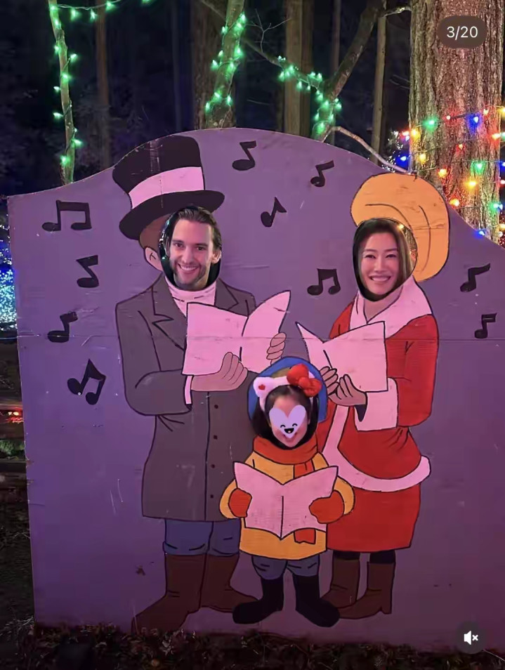 6岁的Sara更是这场庆祝的小主角,穿着厚厚的冬装,在圣诞主题人形板前露着小脑袋,左边是化身圣诞老人的妈妈,右边是绅士打扮的Mathew,她笑得眼睛眯成一条缝,幸福感都要溢出屏幕了。