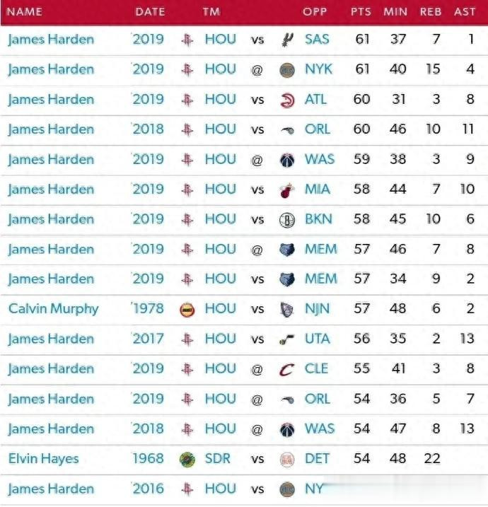 2019年成为哈登的“得分盛宴之年”,他在这一年里接连刷新火箭队史单场得分纪录:两度砍下61分,分别在对阵马刺和尼克斯的比赛中创造队史单场最高分,成为NBA历史上为数不多多次砍下61+的球员;此外,他还交出60分、59分、两次58分、两次57分、56分、55分的恐怖数据,从55分到61分的高分区间,被哈登彻底包揽。这份成绩单不仅让他成为火箭队史唯一一位在单一年份内多次轰下55+的球员,更让火箭史高分榜前十彻底成为他的“个人秀场”。