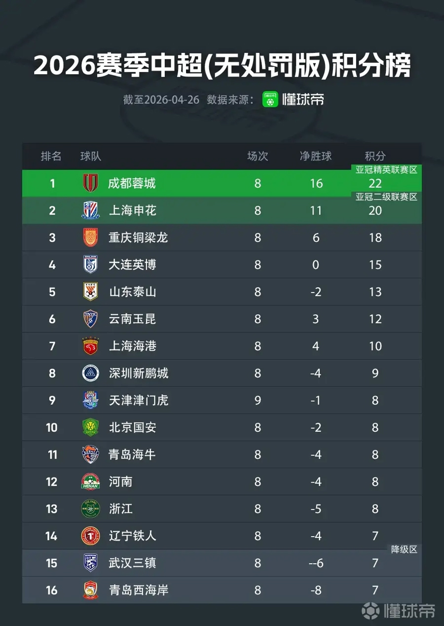 4月26日晚,2026中超联赛第8轮,上海申花客场3比0战胜河南俱乐部,豪取联赛五连胜。申花目前积10分,排在积分榜第五位。这场胜利不仅延续了球队的强劲势头,也让“罚分掩盖真实实力”的话题成为中超焦点——若没有赛季初被扣10分的处罚,申花将以20分位列积分榜第二,仅落后领头羊成都蓉城2分。