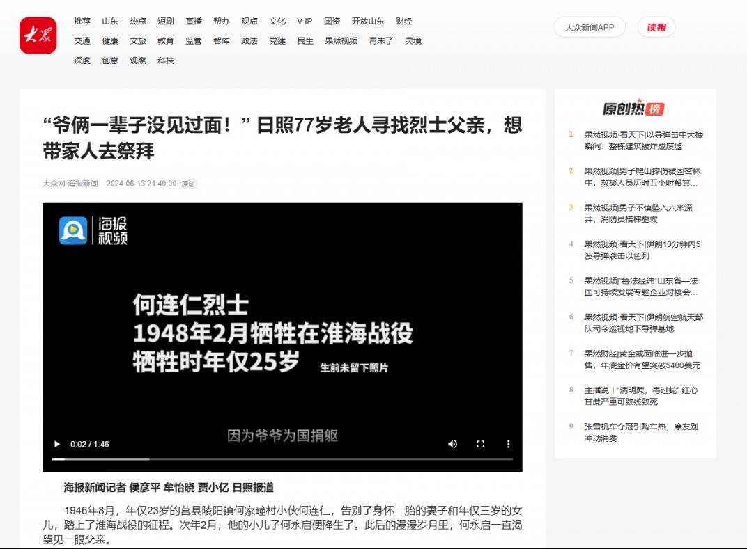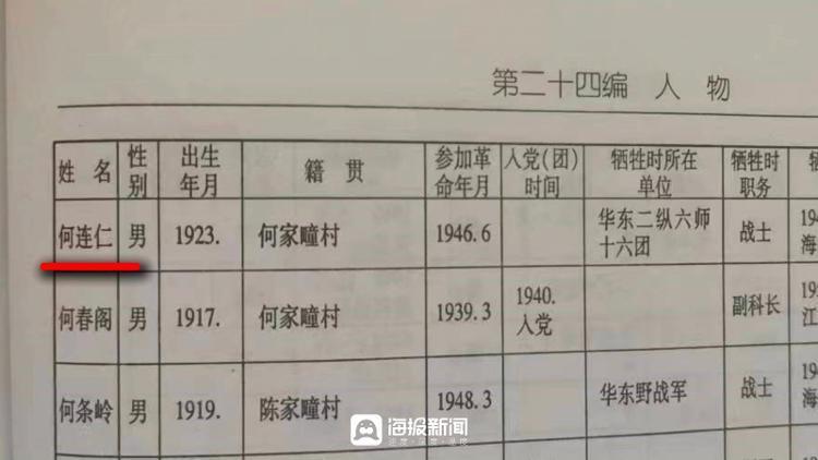 2024年6月13日,海报新闻曾以《“爷俩一辈子没见过面!”日照77岁老人寻找烈士父亲,想带家人去祭拜》为题,报道了山东省日照市莒县陵阳镇何家疃村77岁老人何永启寻找烈士父亲何连仁的故事。