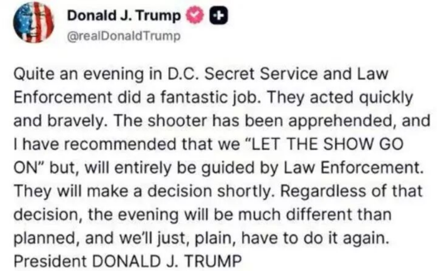 另据@CCTV国际时讯 报道,当地时间4月25日,特朗普在社交平台“真实社交”上表示,华盛顿特区度过了一个非同寻常的夜晚。特勤局和执法部门的表现堪称出色。他们行动迅速且英勇无畏。枪手已被抓获。他已建议让记者协会晚宴继续进行,但他将完全听从执法部门的安排。他们很快就会做出决定。无论最终决定如何,当晚的活动都将与原定计划大不相同。届时,他们只能再举办一次了。
